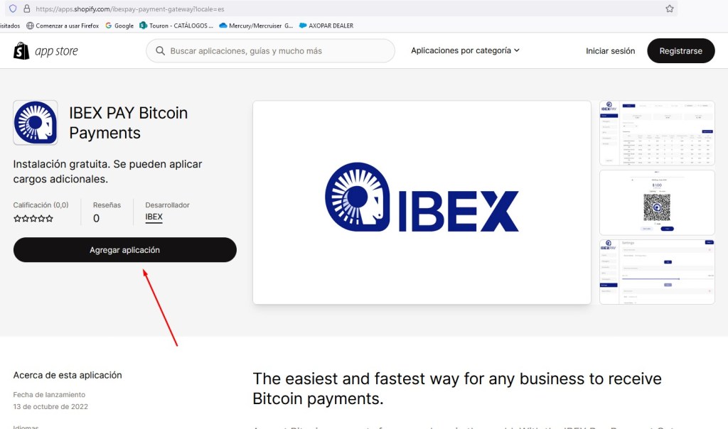 -abrir otra ventana y entrar en la pagina https://apps.shopify.com/ibexpay-payment-gateway Hacer click en «agregar aplicación» –