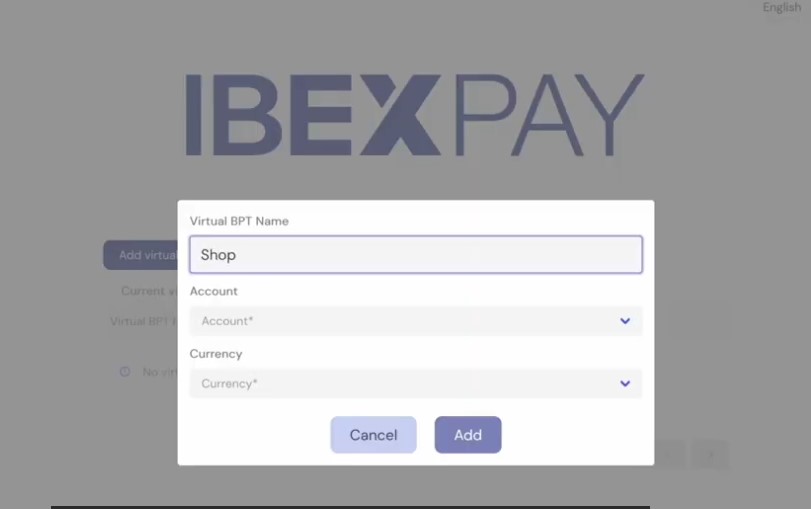 Crea el BTP virtual dandole un nombre (el nombre de tu tienda por ejemplo), escogiendo un «account» (la cuenta que creaste anteriormente en Ibex), y eligiendo Eur como moneda. Luego click en «add»