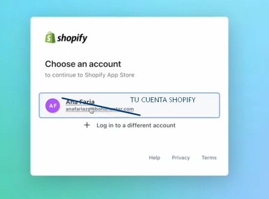 -Te preguntará a cual cuenta shopify añadir la aplicación, y te propondrá la tuya (la que ya hiciste el login). Elijela
