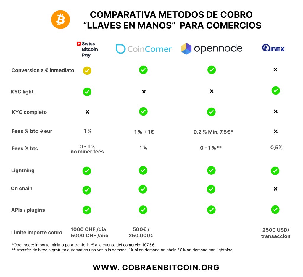 Con respecto a la conversión de bitcoin a €, Coincorner y Opennode dicen convertir los bitcoin a € de forma inmediata cuando el cliente envía bitcoin (es decir cuando el cliente del comercio efectúa el pago), mientras que Swiss Bitcoin Pay hace la conversión una vez al día, a media noche, y esto nos expone a las fluctuaciones del valor de bitcoin entre la hora del cobro y la media noche. La empresa nos ha dicho que en los próximos meses cambiarán su proveedor de cambio y podrán realizar la conversión de forma inmediata como hacen sus 2 competidores.